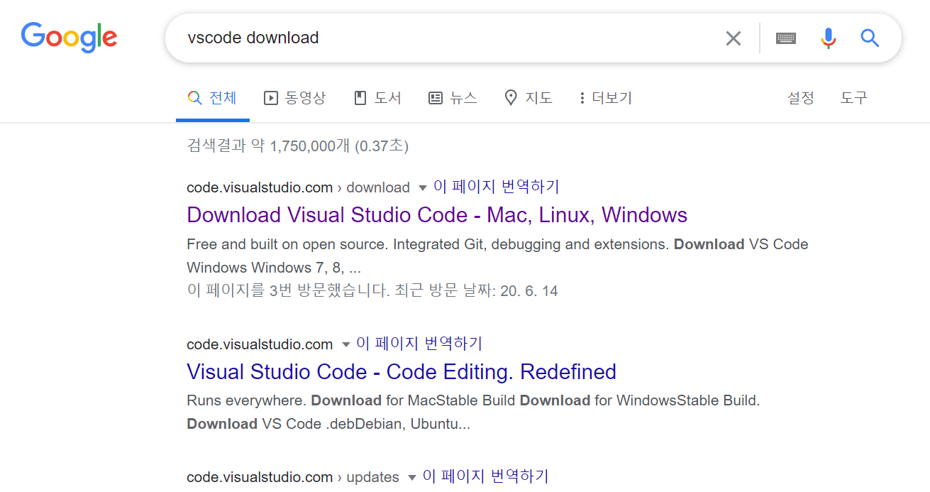 구글에 vsCode download 검색한 후 제일 상단 Download 사이트를 클릭합니다.