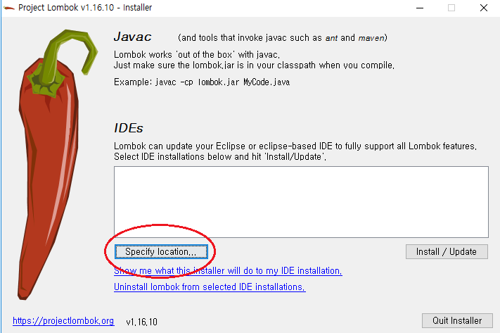 java -jar lombok-${version}.jar 를 입력해서 lombok.jar를 실행 시키면 됩니다.
